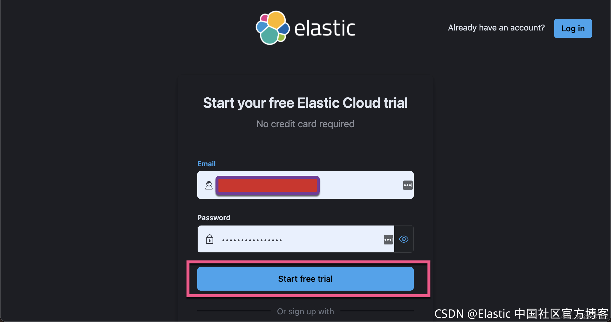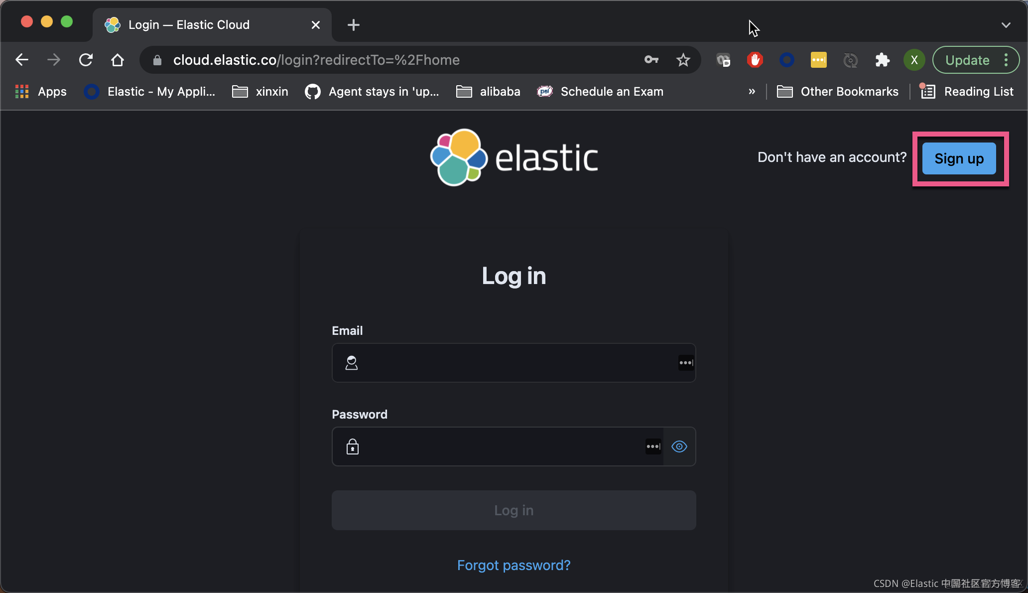 1)进入 …cloud.elastic.co 网址。点击 Sign up: