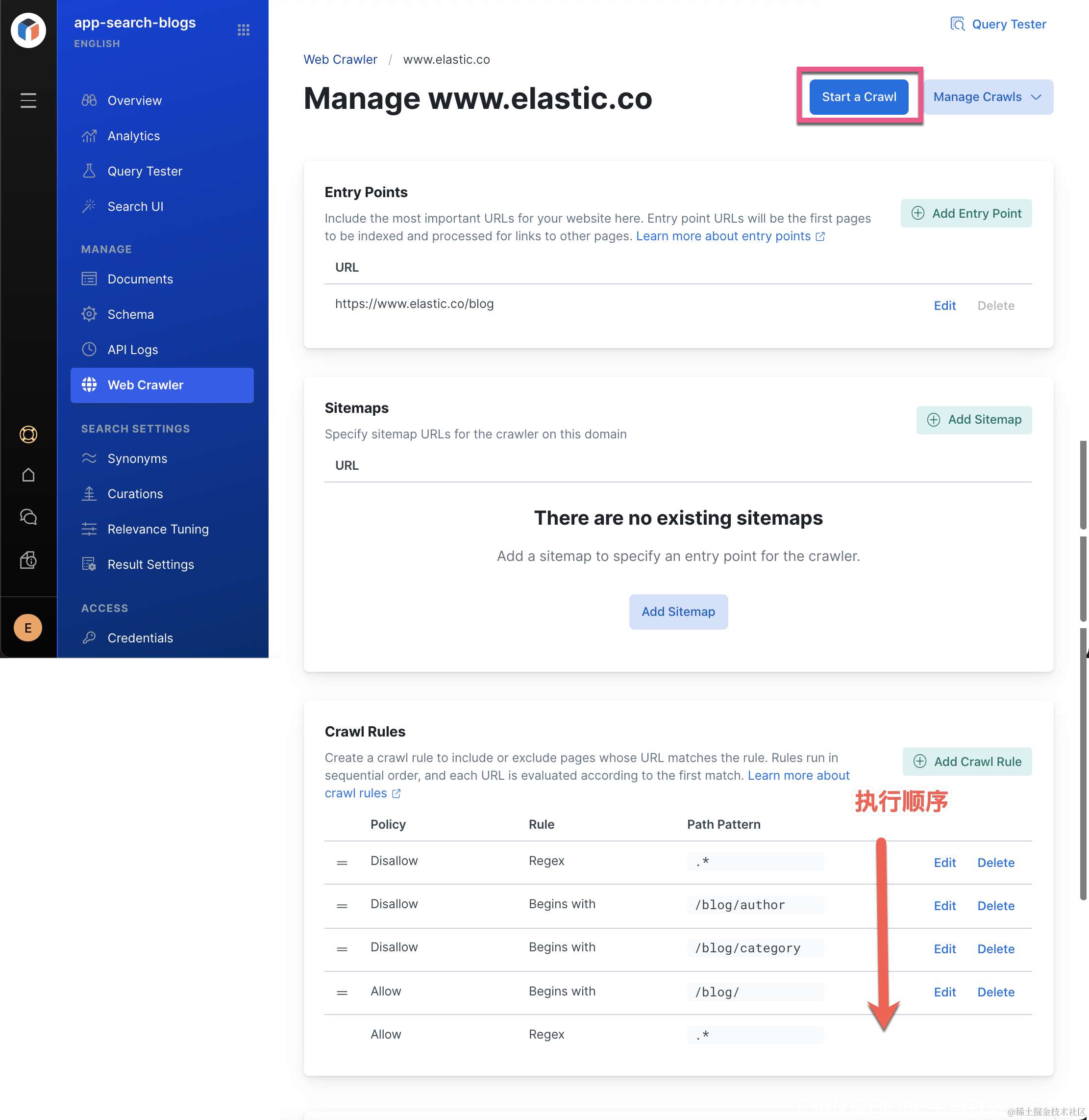 点击 Confirm 按钮。这样就保存了我们的设置。我们稍等片刻,等新的配置起作用后,我们再重新点击 Start a Crawl 按钮: