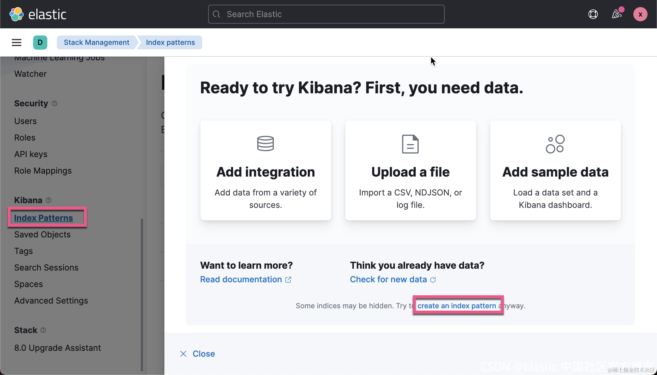 2) 在 Kibana 中可视化任何数据之前,你需要创建一个索引模式。 打开左侧菜单并单击 Stack management。 在 Kibana 下选择 Index Patterns,然后单击创建索引模式。