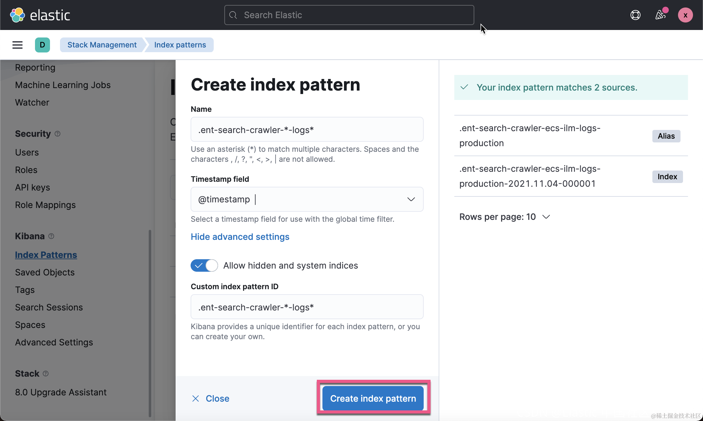 这样我们就创建了这个 .ent-search-crawler-*-logs* 索引模式。