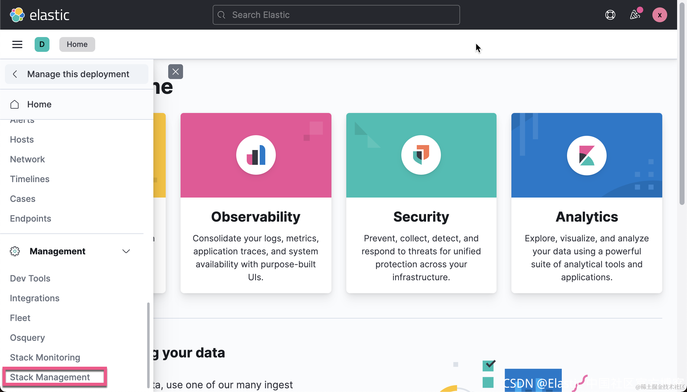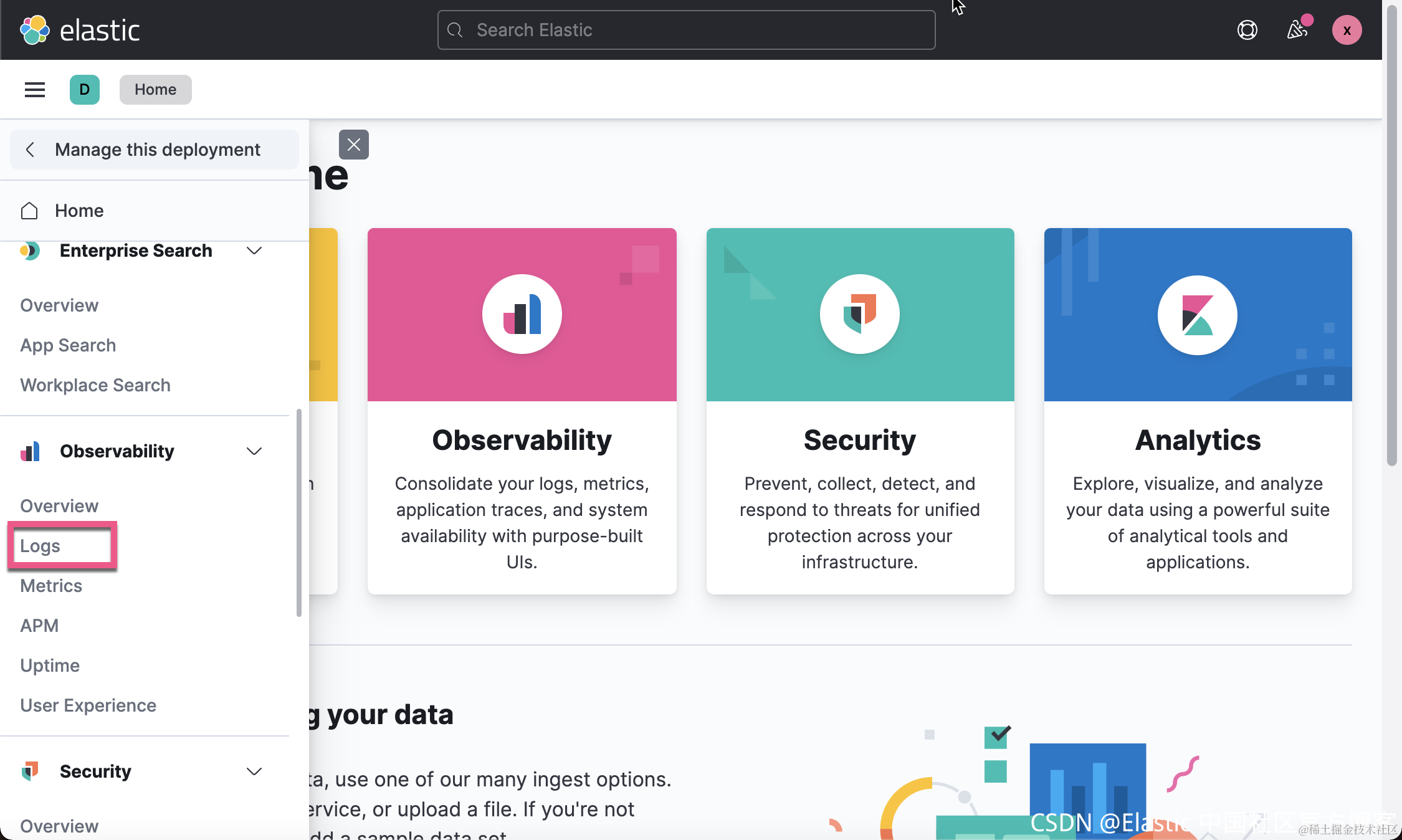 在我们今天的练习中,我们将不使用 Kibana。我们将使用 Enterprise Search。