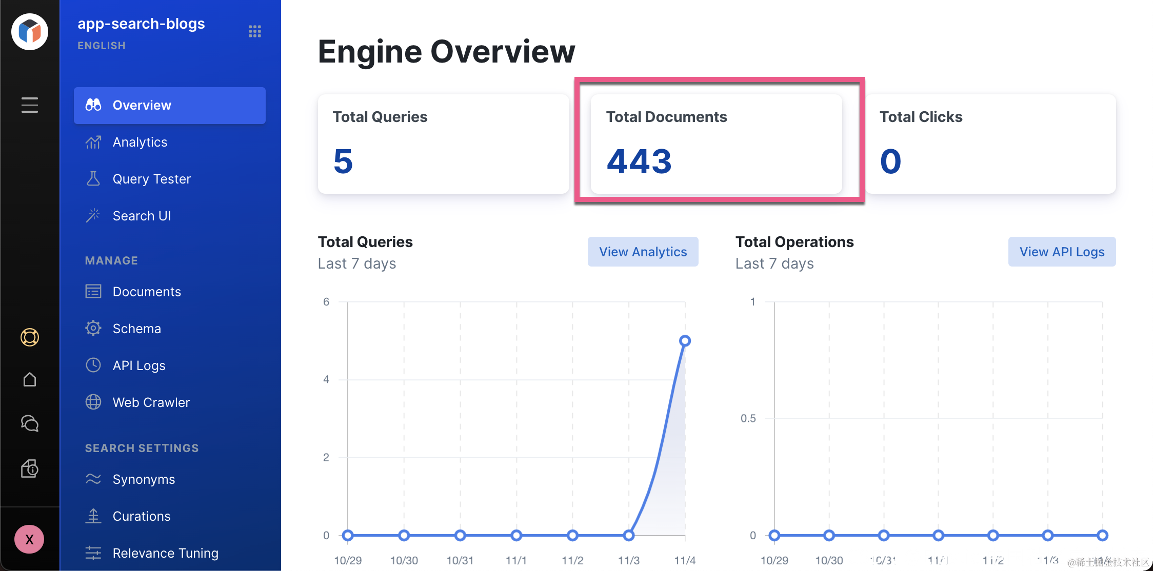 过一段时间后,我们可以在 Overview 中看到 443 个文档。