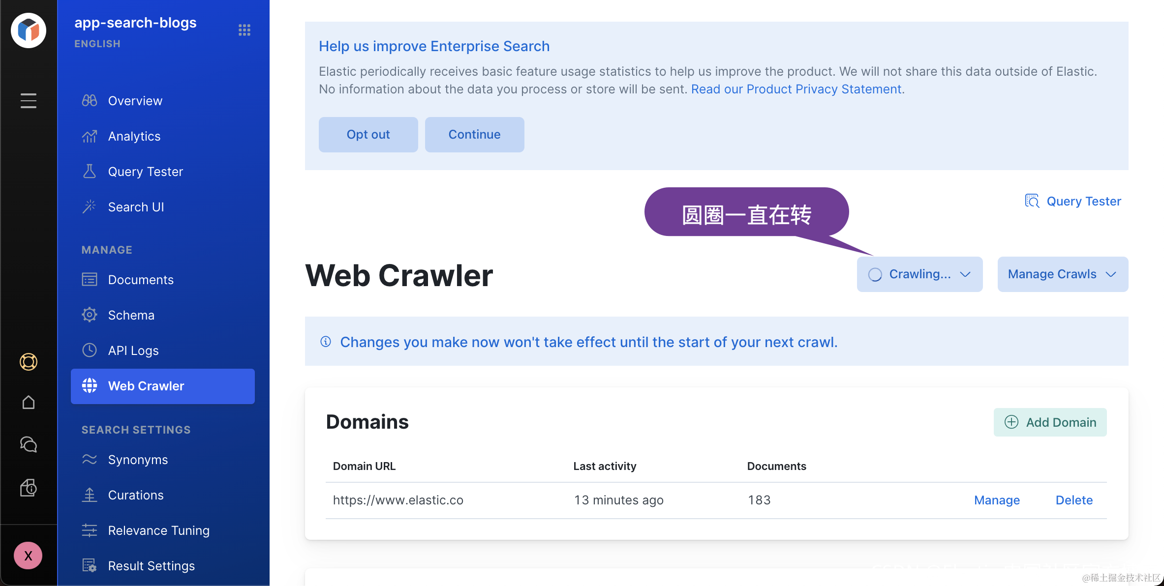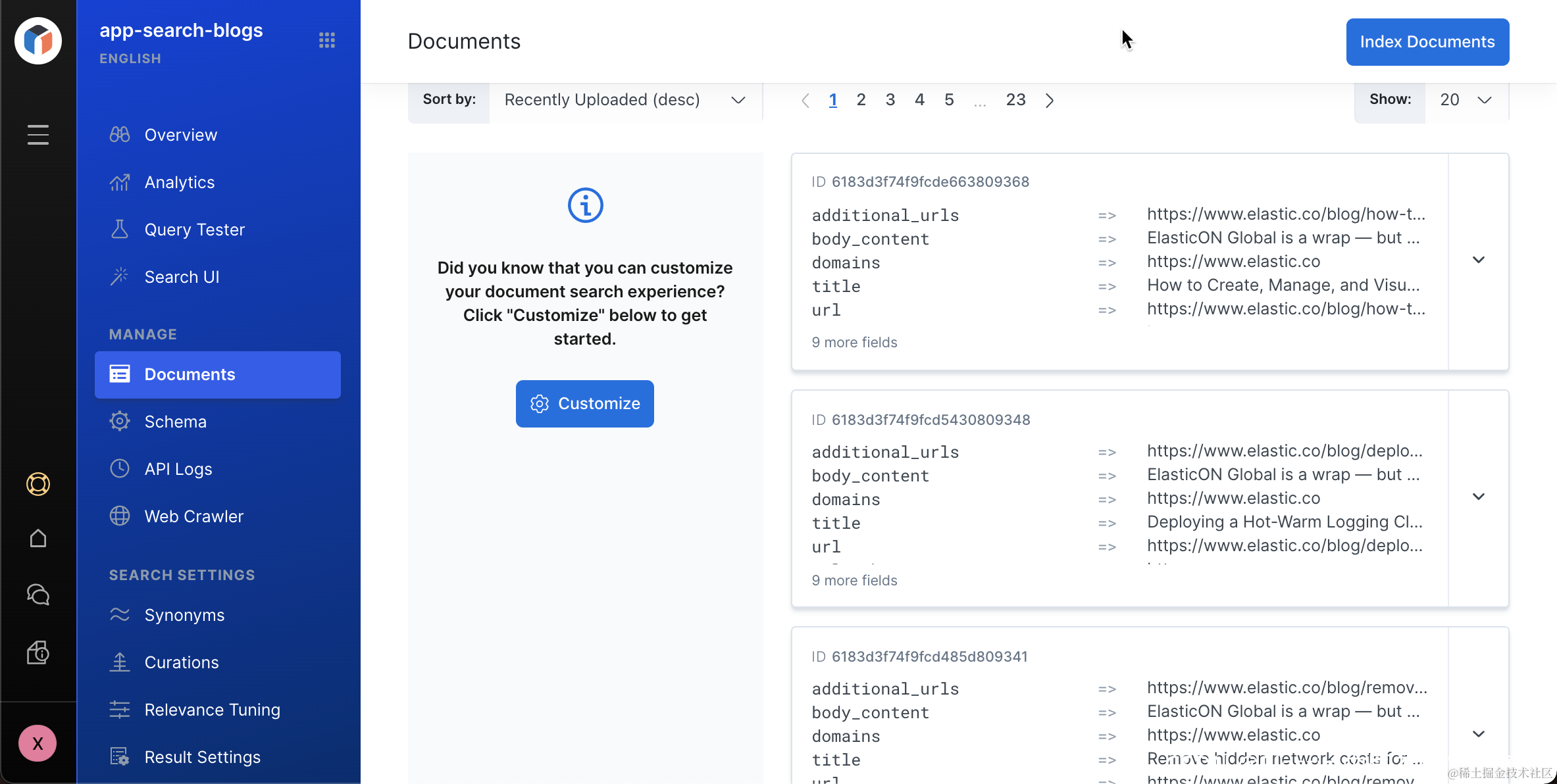 好了,我们已经知道如何把一个网站上的文档摄入到 Elasticsearch 了。我们需要等一段时间来完成 Crawl 的动作。