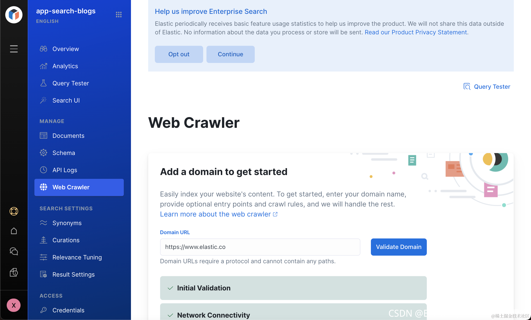 首先,我们需要填入的是 domain。我们需要爬虫的网站是位于 www.elastic.co 网站上的,所以在上面我填入 www.elastic.co。我们也可以点击 Validate Domain 来检查网络的连接性。