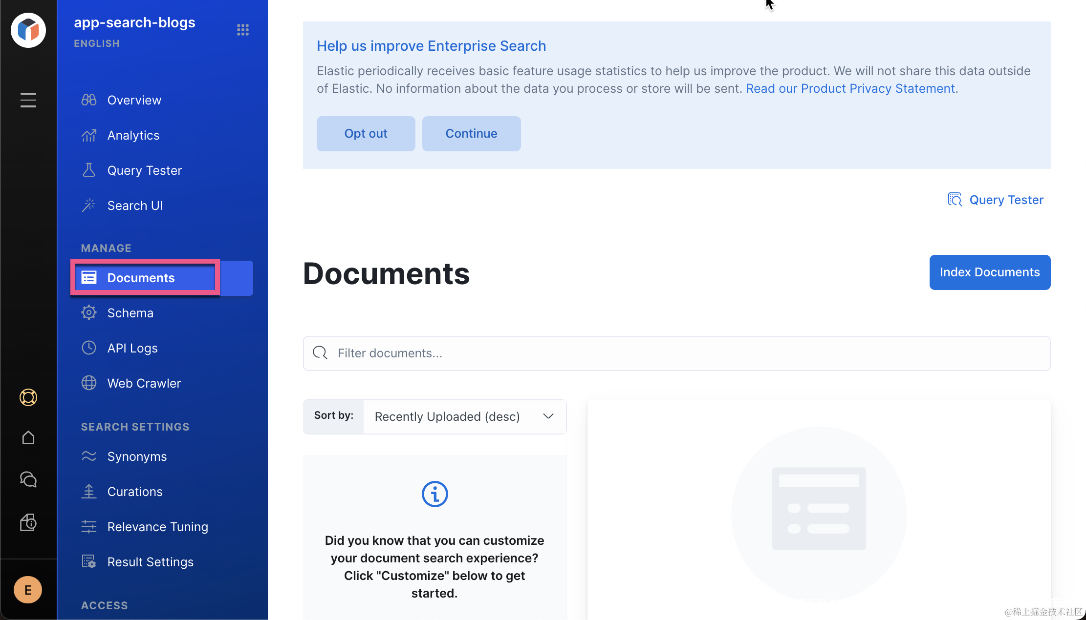 上面的圆圈一直在转,它表明我们的 Crawl 是一在进行中。我们重新进入到 Documents 窗口,我们可以看到新摄入的文档: