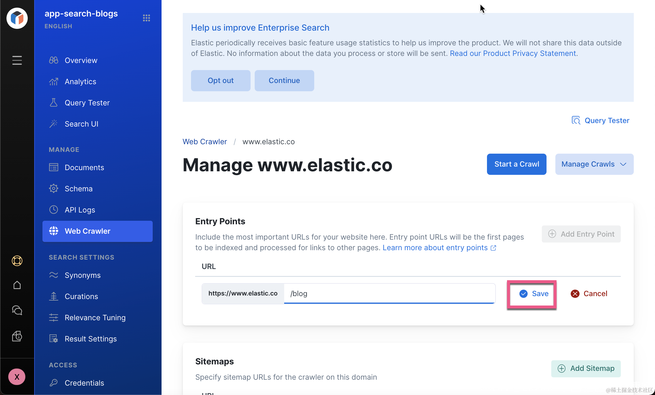 针对我们的应用场景,我们定义唯一的一个入口地址 www.elastic.co/blog/。 点击上面的 Save 按钮: