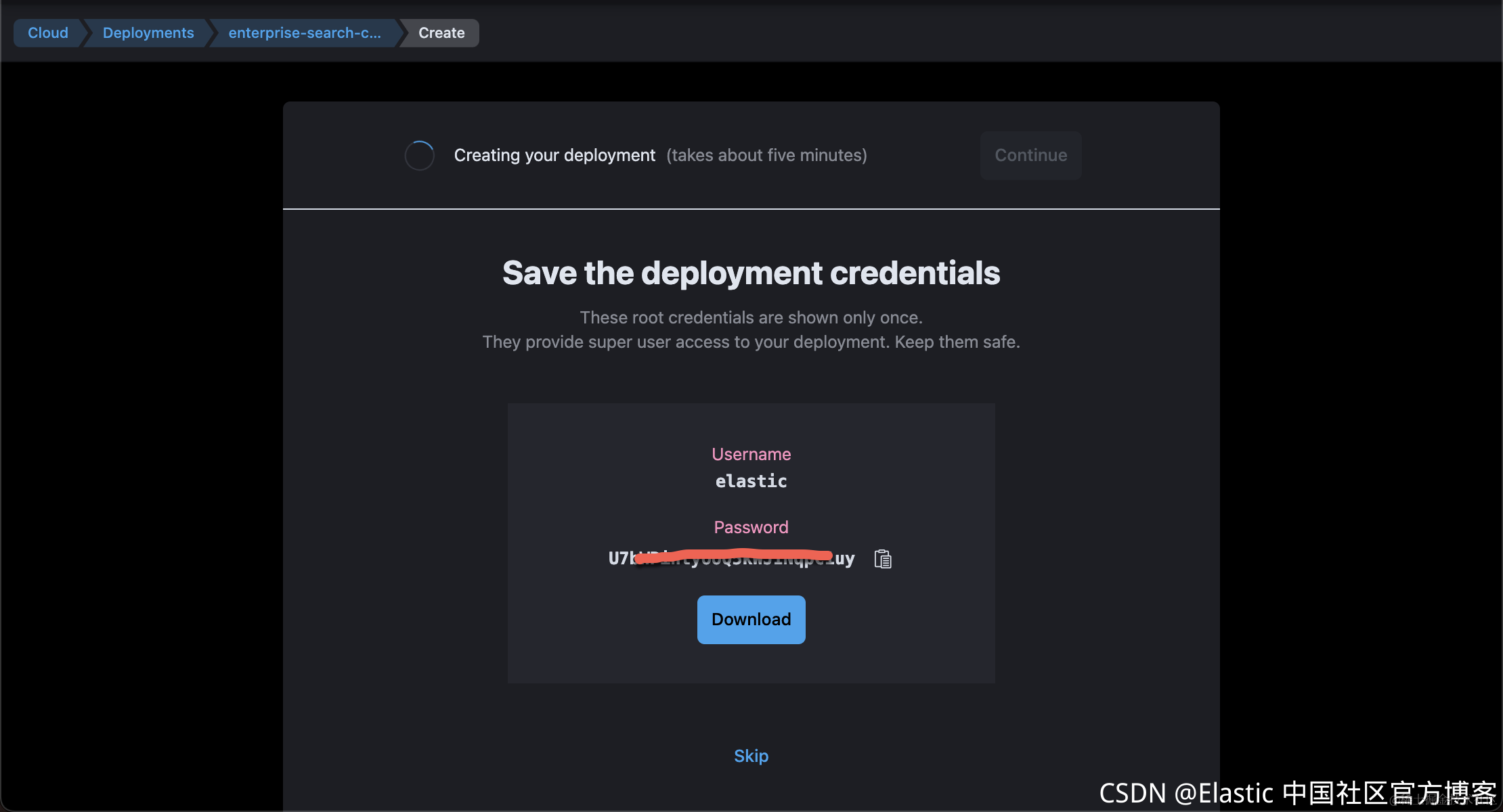 点击上面的 Download,这样就可以保存我们的密码到一个 .csv 文件中。这个密码在以后的数据导入及登录中需要用到,所以你需要妥善保存。