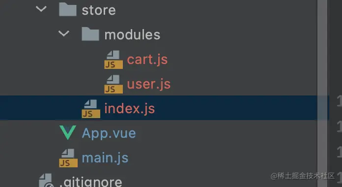 首先在src/store文件夹下新建一个modules文件夹,在这下面我们可以新建我们不同模块的状态处理文件,这里我新建了一个user.js、cart.js2个模块状态文件,如下