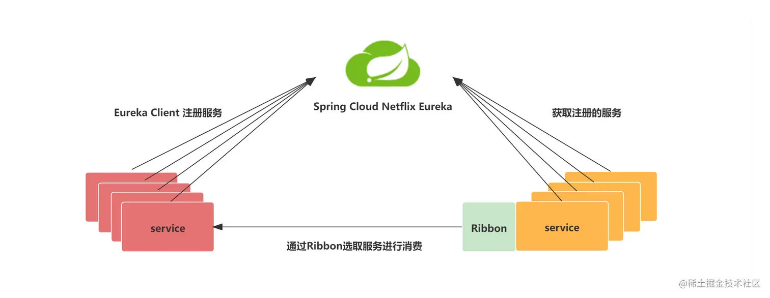 如上图,服务提供者将自身服务信息注册到Eureka上,服务消费者从Eureka中获取可用服务实例信息,通过客户端负载均衡器Ribbon选择服务发起请求。