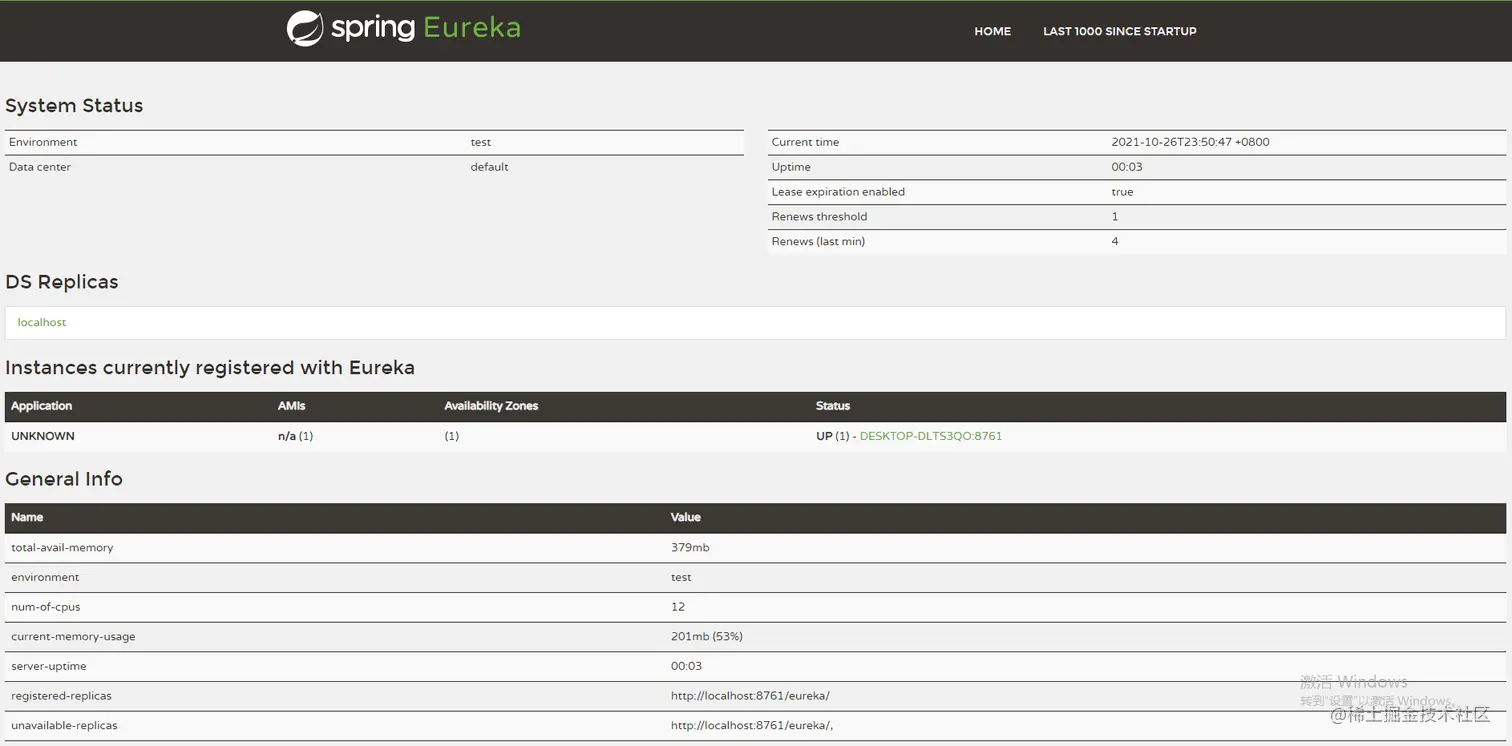 配置一:此时Eureka启动,并未有任何服务注册到当前Eureka中,但是实例表中有一个UNKNOWN实例,这是因为Eureka默认会将其本身注册到上面。