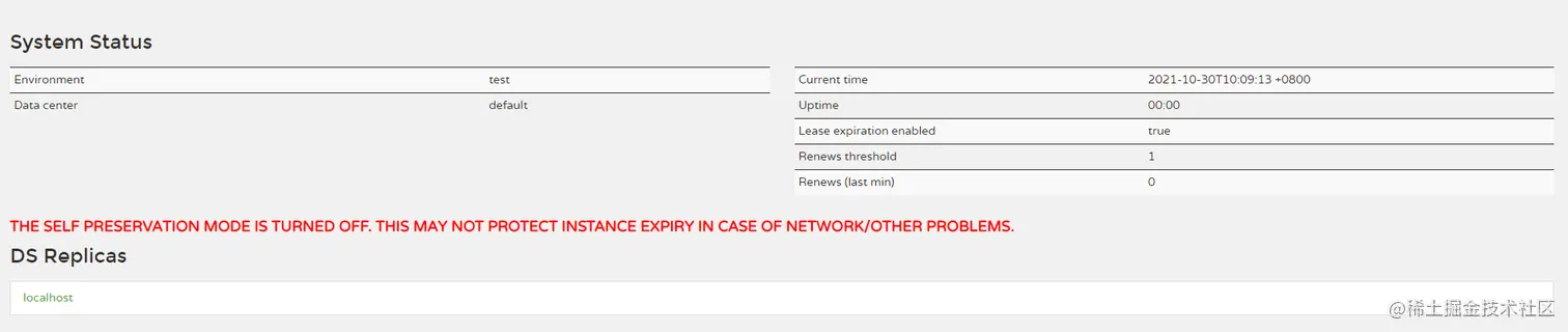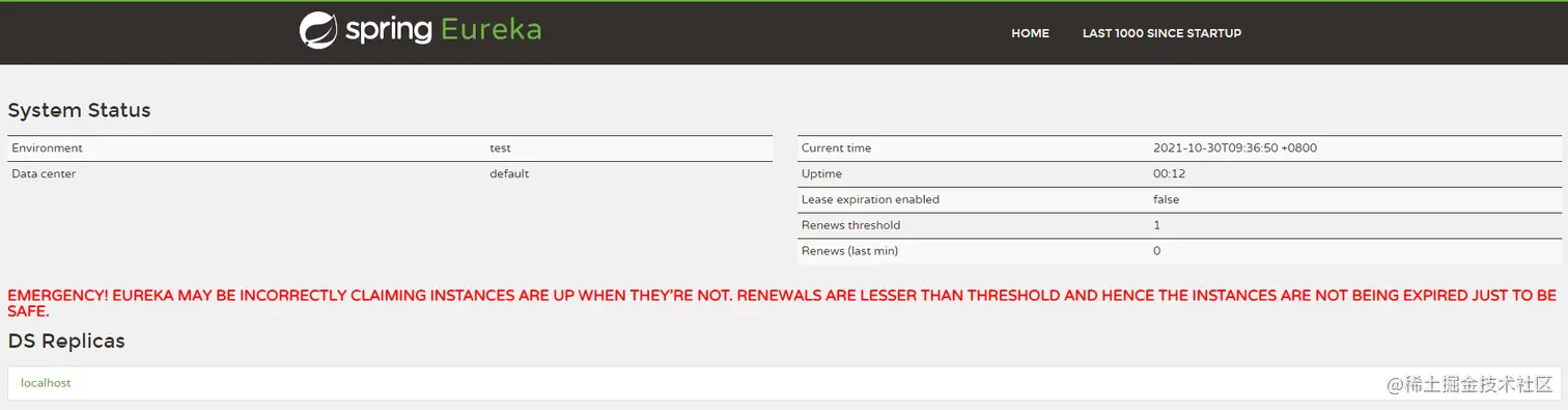 我们先来看一个警告信息,当Eureka服务一直未接收到其他服务注册时,会在Eureka的Dashboard中出现如下红色警告: