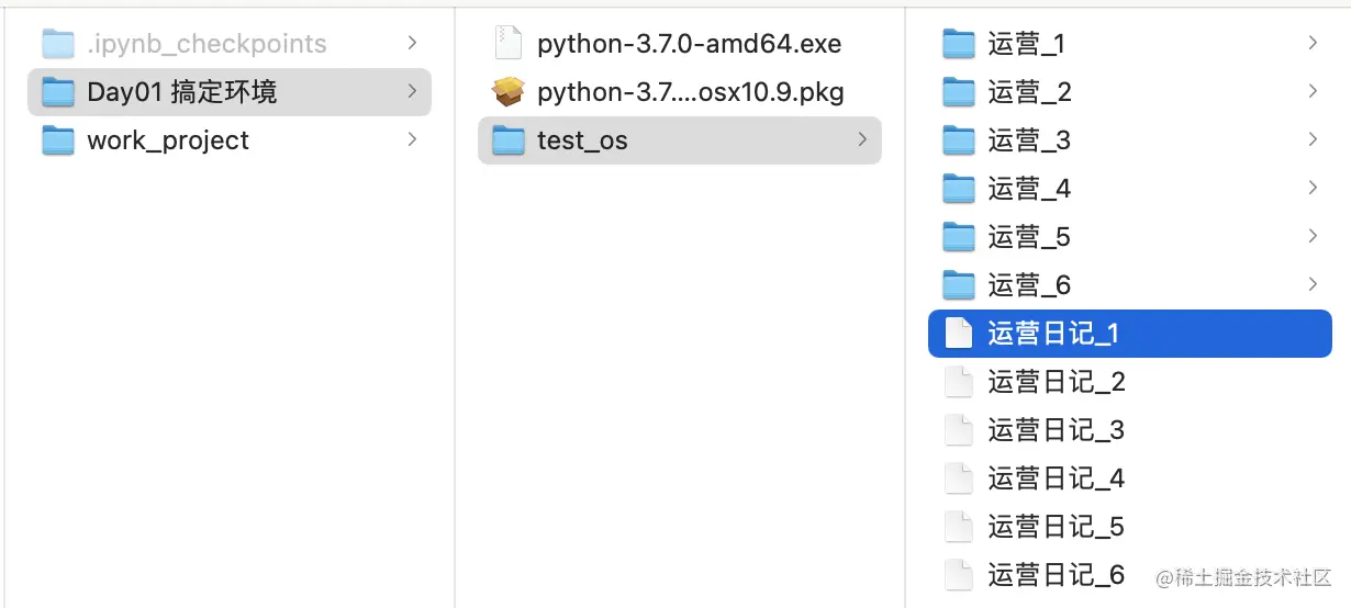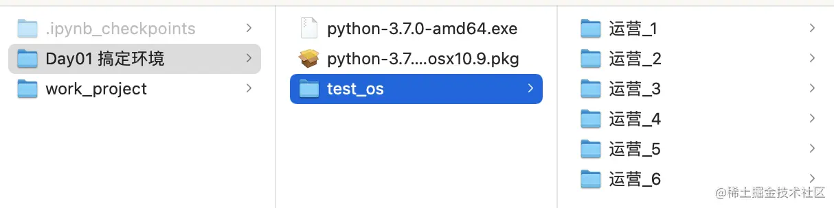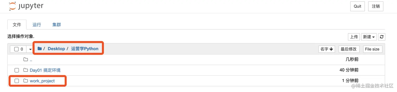 1、锻炼操作: 在jupyter notebook里在,删掉之前在桌面新建work_project文件夹,然后新建一个文件夹运营学Python,并进入该目录下新建两个文件:Day01搞定环境和work_project,Day01搞定环境里记录本次自己的学习笔记,实践截图;work_project里存放本系列所有代码脚本文件。(如下图所示)