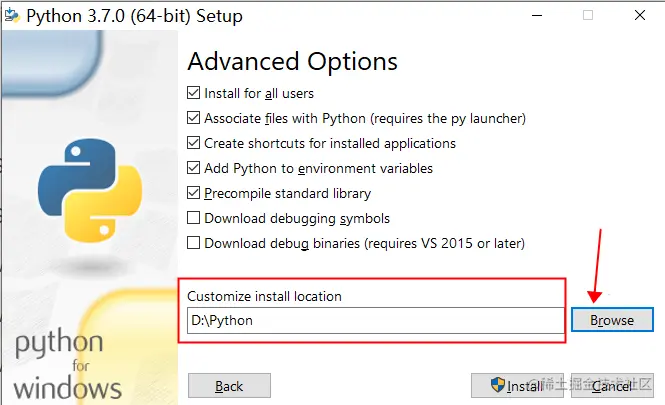 2)遇到教程中没有的页面就直接点击Next即可,进入到下方页面,按图中示例勾选需要安装的配置即可,另外点击Browse,选择安装路径,图中是在D盘中新建了一个文件夹Python,然后安装在其中。按图示配置好后,点击Install按钮即可进行安装。
