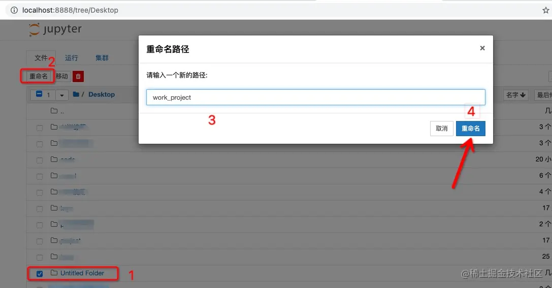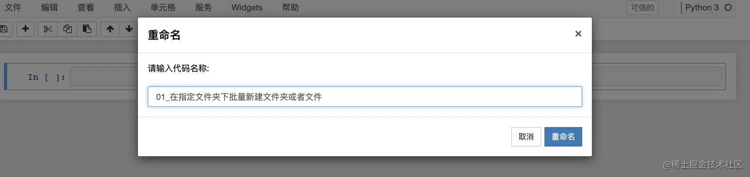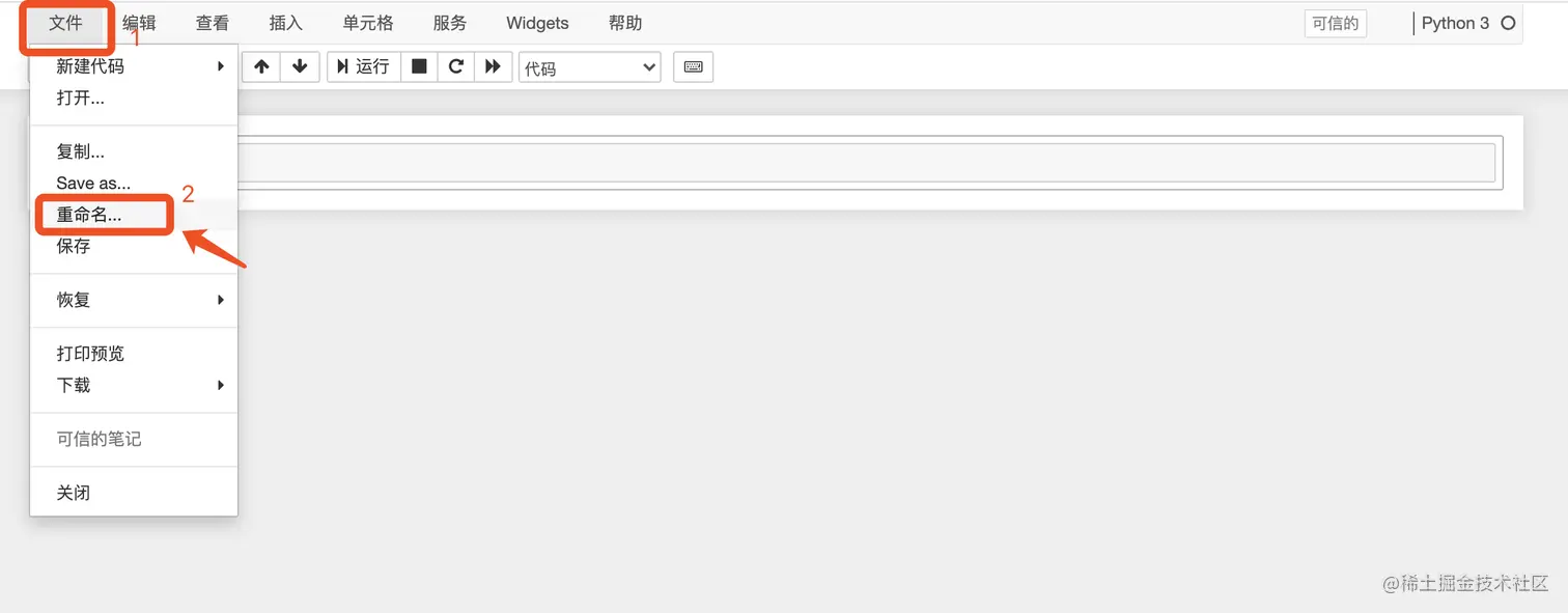 点击文件打开文件菜单,然后在文件菜单中选择重命名,可以给新建的Python3文件(后面称为notebook)进行重命名。