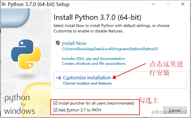 1)点击下载好的安装包,即可进入下图所示安装界面,然后勾选上Install launcher for all users和 Add Python 3.7 to PATH,主要是安装Python编辑启动器和将Python环境添加到系统环境变量中。