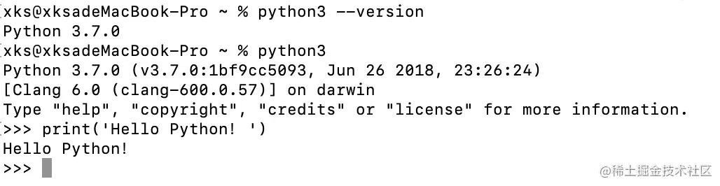 安装好后,Mac直接打开终端,然后输入python3 --version即可看到自己安装好的Python版本,然后输入python3,即可进入自带的代码编辑环境,我们可以尝试输入print('Hello Python!'),然后回车,看看效果。