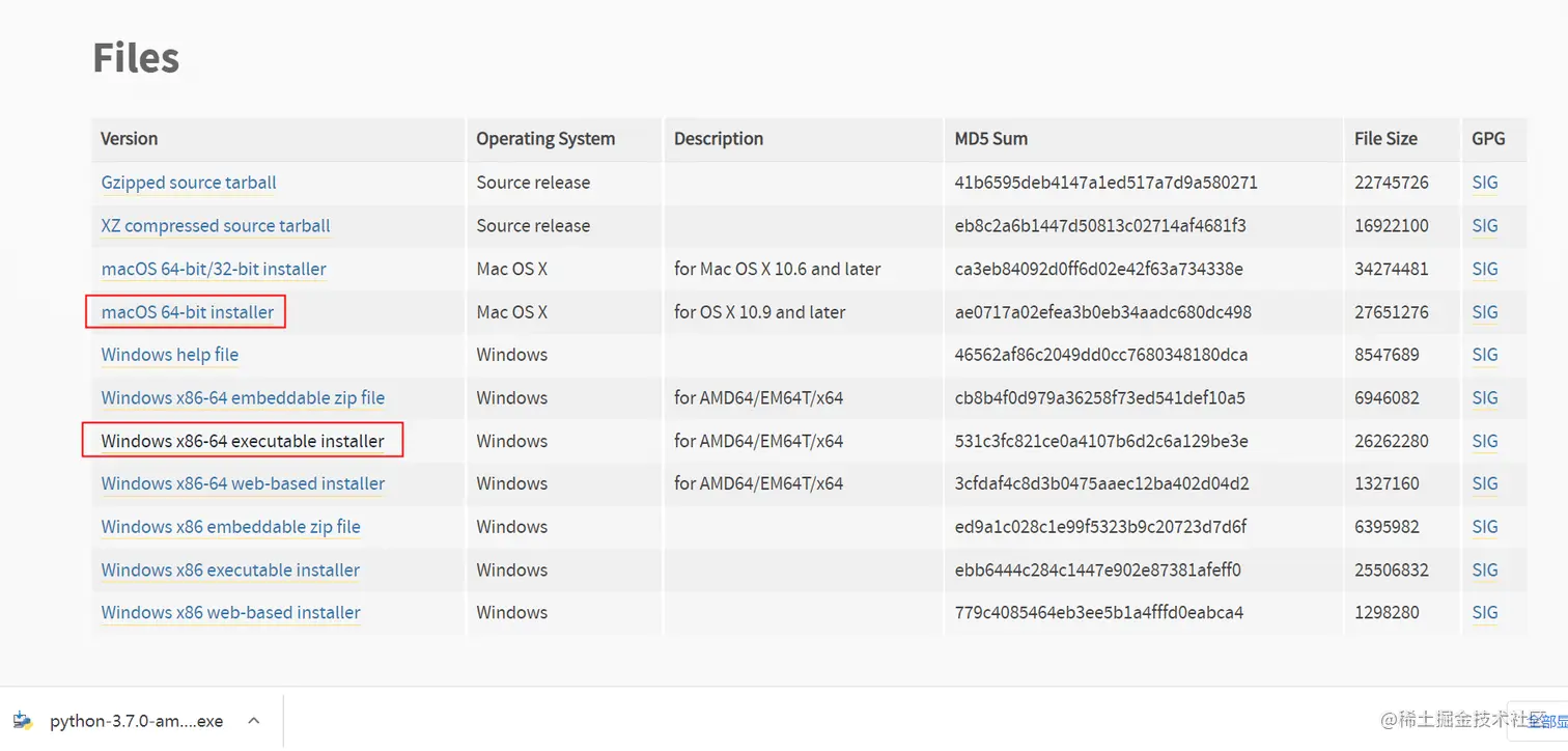当然你也可以直接访问:www.python.org/downloads/r… 选择合适版本进行下载,一般选择下载安装包安装,如图圈红的两个安装包,一个是mac的,一个是windows下的。
