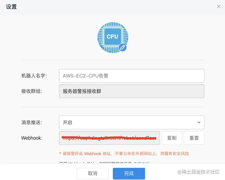 4.设置一个较小的警报阈值用于测试,回到钉钉查看机器人消息