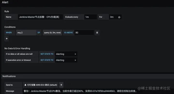 报警规则:均值大于80变为“pending”状态,pending状态延续3分钟启动Alert