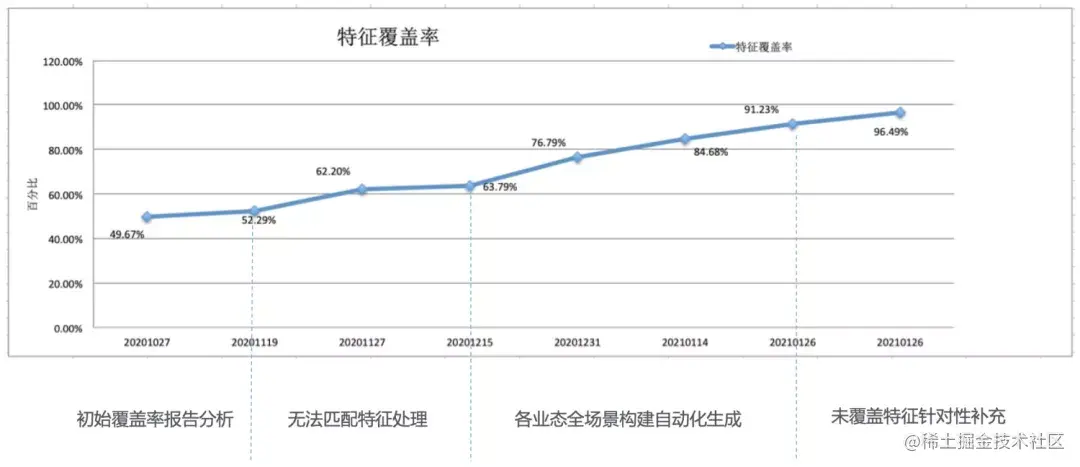 在交易领域的特征覆盖率的提升经过了以下几个阶段,初始的测试单据(日常测试单据+链路自动化单据)特征覆盖率仅50%左右,覆盖率确实不高,通过覆盖率报告的分析发现,除了确实无单据覆盖的特征,还有一类问题是有单据覆盖但是平台无法匹配上的特殊字符类特征值或不可穷尽枚举类特征值,经过二次处理后,特征覆盖率提高到65%左右;第三阶段,现有的全业态全场景用例构建出来后覆盖率提升到90%左右,剩余的10%特征基本是线上特定时期小概率出现场景阶段性单据没分析到或暂时无法构建数据的特征,经过指定单据有针对性地补充后特征覆盖率达到96%,至此覆盖率达到我们期望的95%以上,基线用例搭建完成。