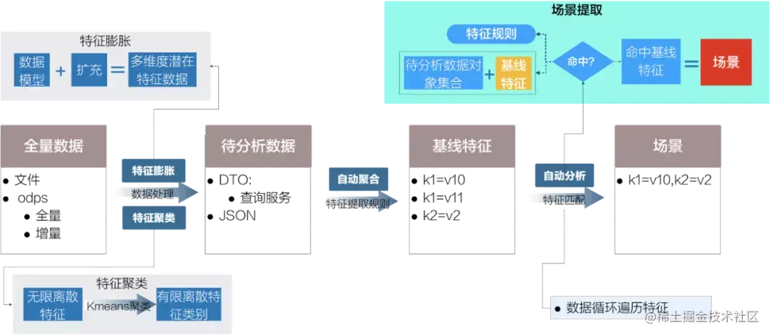 有了基线特征后,基于基线特征形成解析规则,再将全量数据基于特征规则匹配处理,对于命中规则的进行打标处理,即可识别出匹配基线特征的数据集合,这些数据集合对于每一条数据代表的特征组我们称之为场景。具体的处理流程如下图所示。