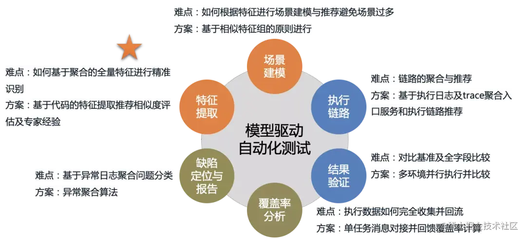 结合上文的背景及思考,推演出本文的模型驱动自动化解决策略包含:特征提取、场景建模、链路执行、结果验证、覆盖率分析、缺陷定位及报告。