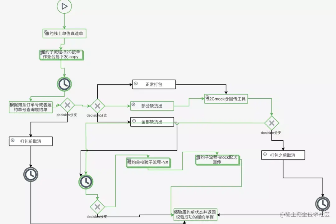 执行链路推荐出来后,这时候的链路还是无法执行的,我们的目标是根据推荐能够自动生成执行链路,只是当前基于进展的考虑,我们先将推荐的链路进行人工链路编排以执行场景模型中的数据。以盒马"履约"领域的系统执行流程链路为例,如下,我们将对所有业态的数据的处理进行统一流程编排,如此,即可更大限度和真实的处理模型数据。
