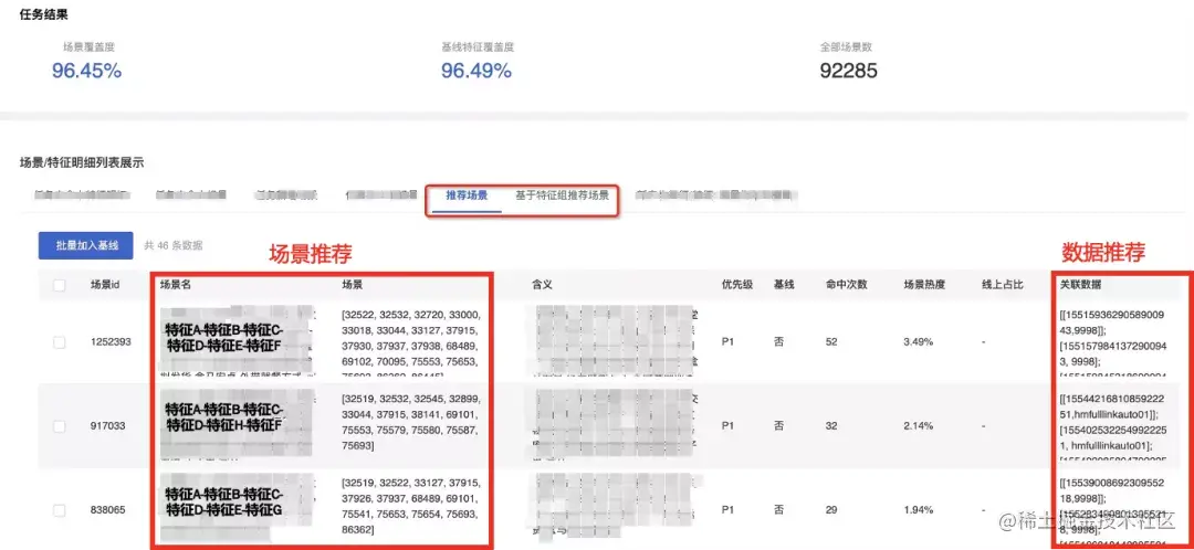 进行特征规则匹配处理后,可识别出场景集,这些场景的集合对我们来说至关重要,因为这些场景集合从一定意义上要代表我们的线上全量场景。如下图所示,除了有场景的推荐,还有场景对应的数据的推荐。这些数据后续我们会进行处理并进行执行链路的驱动。