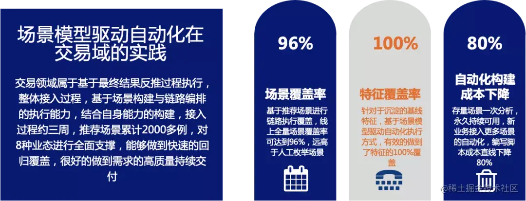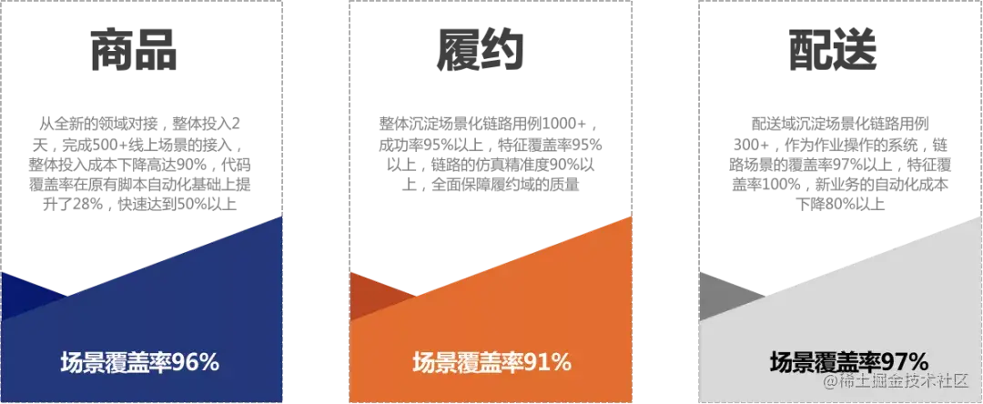 在配送领域:配送域沉淀场景化链路用例300+,作为作业操作的系统,链路场景的覆盖率97%以上,特征覆盖率100%,新业务的自动化成本下降80%以上。