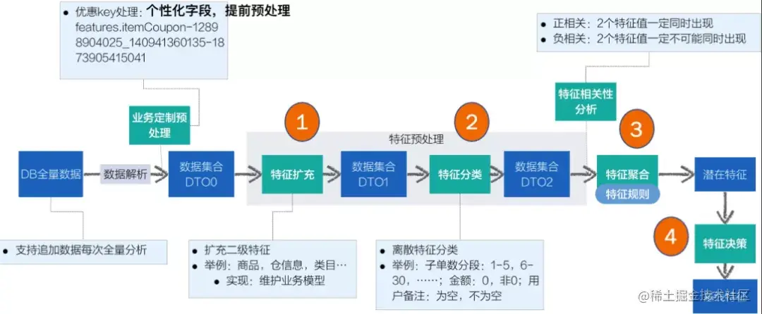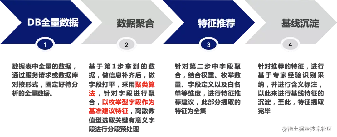 本节重点介绍特征提取的通常方法,当前阶段,我们是以数据库的全量数据作为特征提取的来源,当然不少团队也在尝试使用接口调用过程中的全量入参数据。具体为: