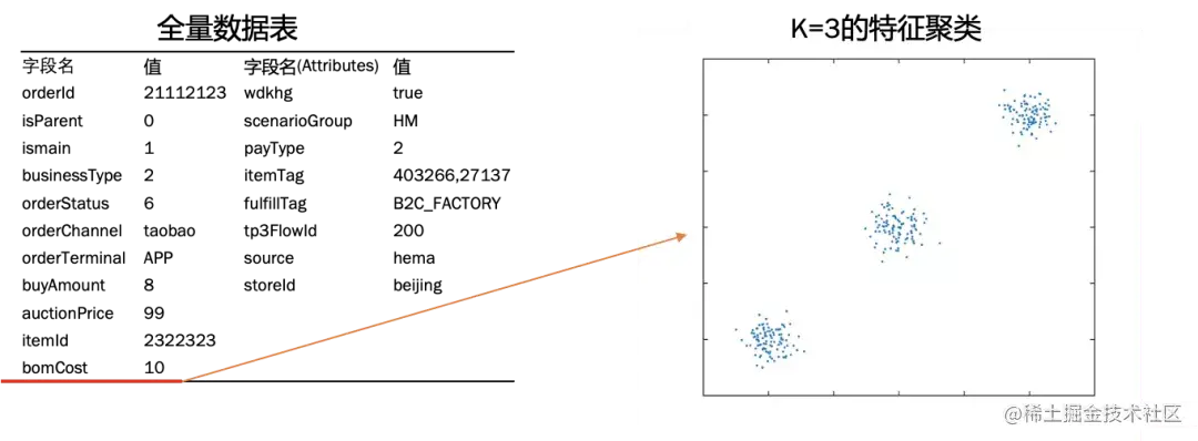2)数据的聚合:对于查询的数据进行信息补齐后,字段打平,采用聚类的方式针对每一字段进行聚合,以出现有限数量的字段作为特征字段进行基线特征的沉淀,对于离散型的数据会选择合适的区间进行分段处理。