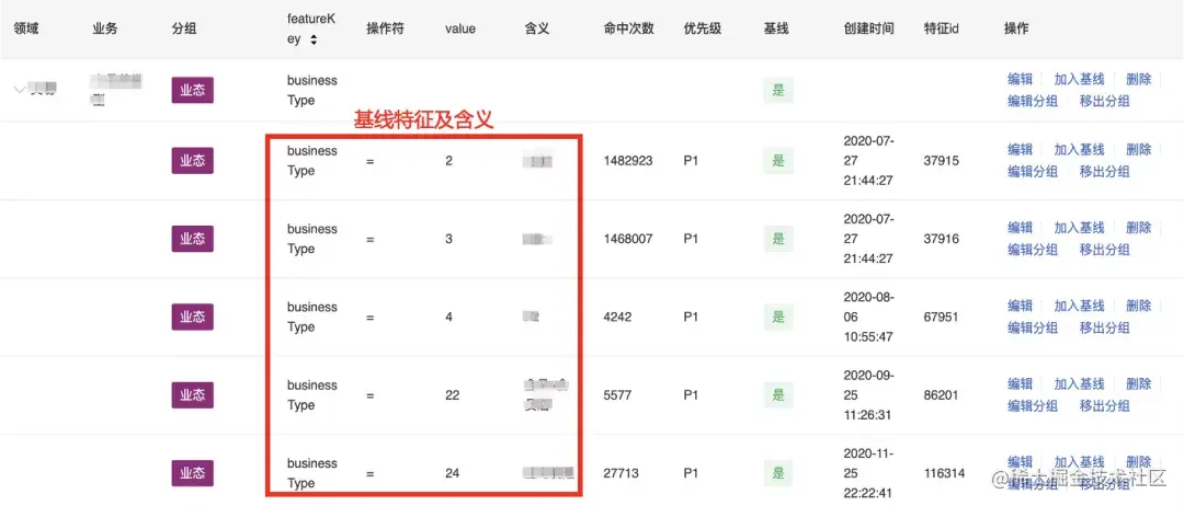 以盒马某业务领域为例,下图展示的是最终有效的特征集合,根据基线特征,我们的做法是都标注了具体的含义,如此,便可很容易根据一个领域的业务特征识别出该领域的数据场景。