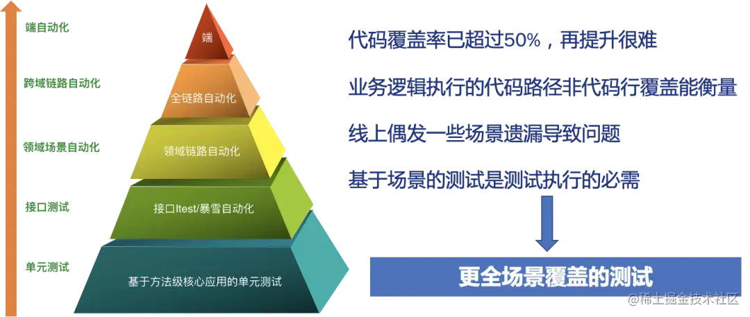 在盒马,前期业务在狂奔,自动化基础较薄弱,近三年来,经过盒马人的不断突破,已经具备了一定的自动化体系,因为盒马业务的特点,盒马属于麻雀虽小但五脏俱全,有独立App,有自营的物流体系,有自己的供应链体系,因此在自动化方面,我们从最基础的单元测试、到接口测试、再到领域场景自动化及跨领域的自动化以及端的自动化方面都有积累。即便如此,我们的代码覆盖率在超过50%之后很难有比较大的提升,另外,代码的覆盖并不能全部代表业务场景的覆盖,一些线上漏测的问题仍然偶尔发生,因此,对于盒马来说,基于较全场景的测试是必须。