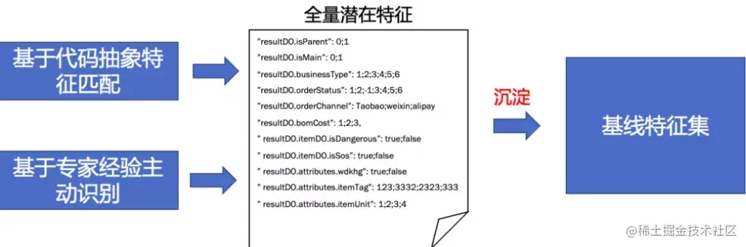依赖上述聚合出来的全量潜在特征数据,在特征决策模块会基于代码中抽象出的特征字段进行匹配,当然最重要的是依赖于业务领域的测试专家经验进行主动识别标注,最终沉淀出领域的基线特征集合。