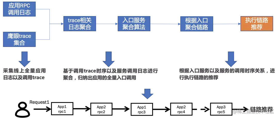 二、执行链路构建:重点在于如何自动构建出克执行的系统调用链路。大致思路为:1)基于落盘数据获取线上执行全链路的所有鹰眼;2)根据鹰眼(trace)及系统调用关系构建执行链路;3)执行链路编排构建链路执行能力;