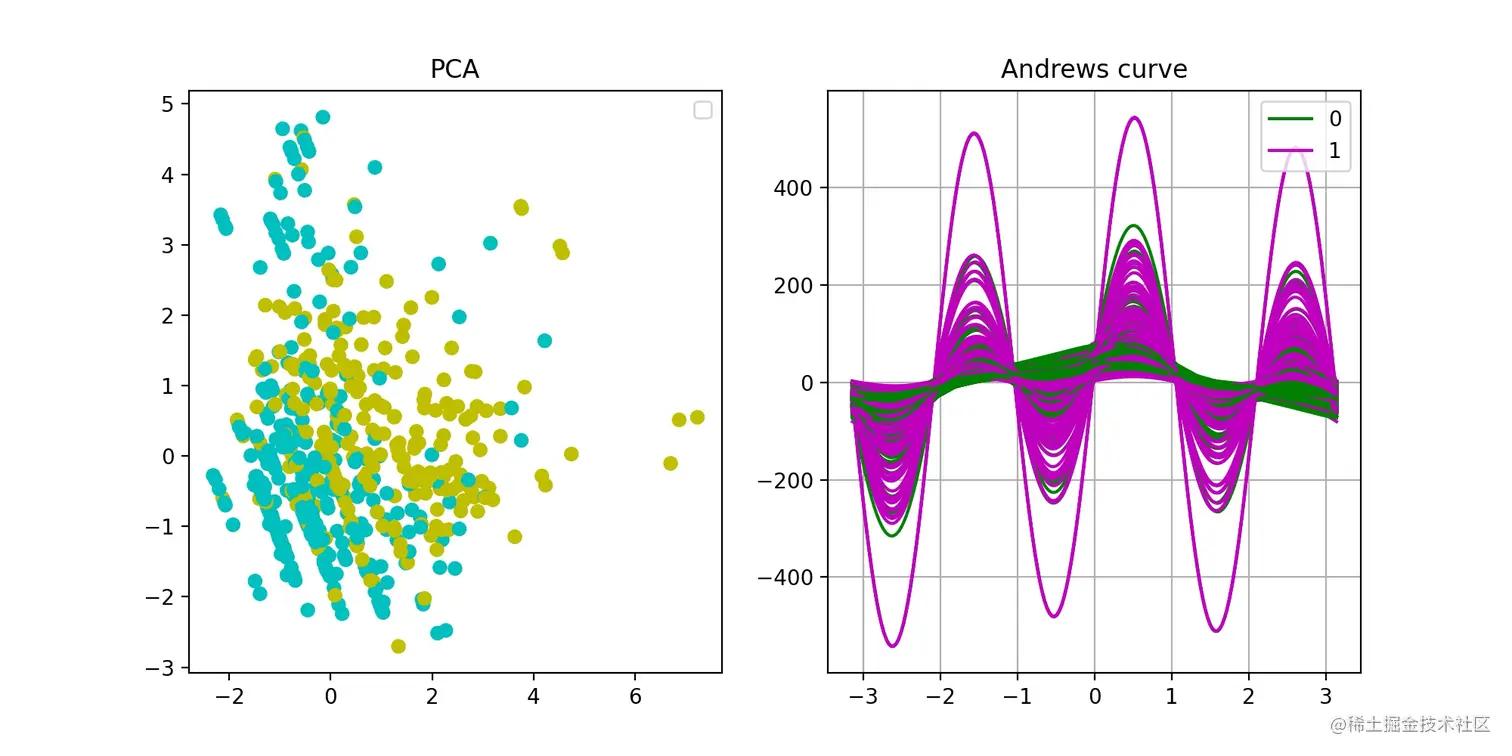 - 对数据集进行PCA降维可视化,再绘制Andrews曲线,观察类别间的差异性