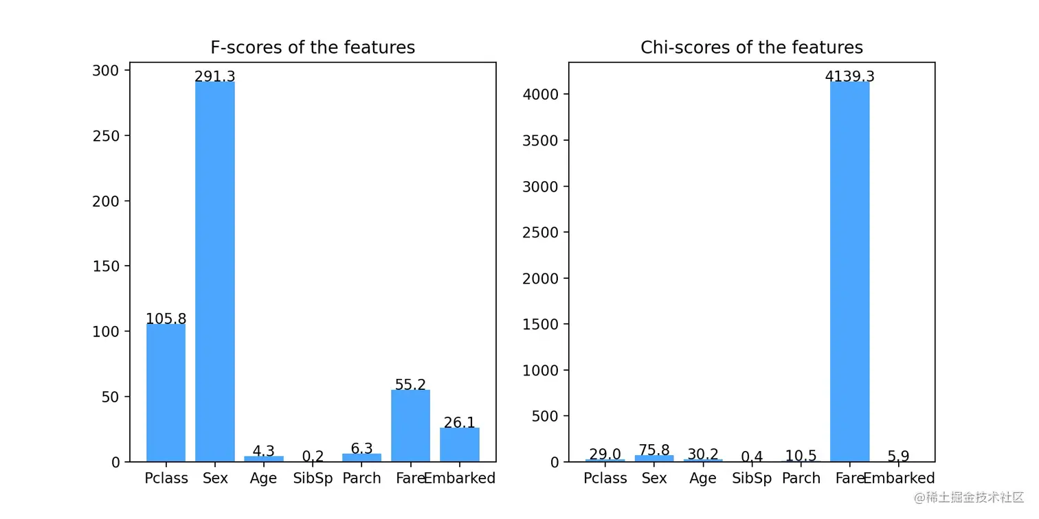 特征分析就是评估每个特征的质量,也就是特征与因变量(类别标签)的相关性程度,常用的方法有方差分析、卡方统计等。这里我们调用sklearn.feature_selection.SelectKBest模块,构建特征选择模型,使用F值方差分析来分析各个特征,并最终将结果可视化为条形图。