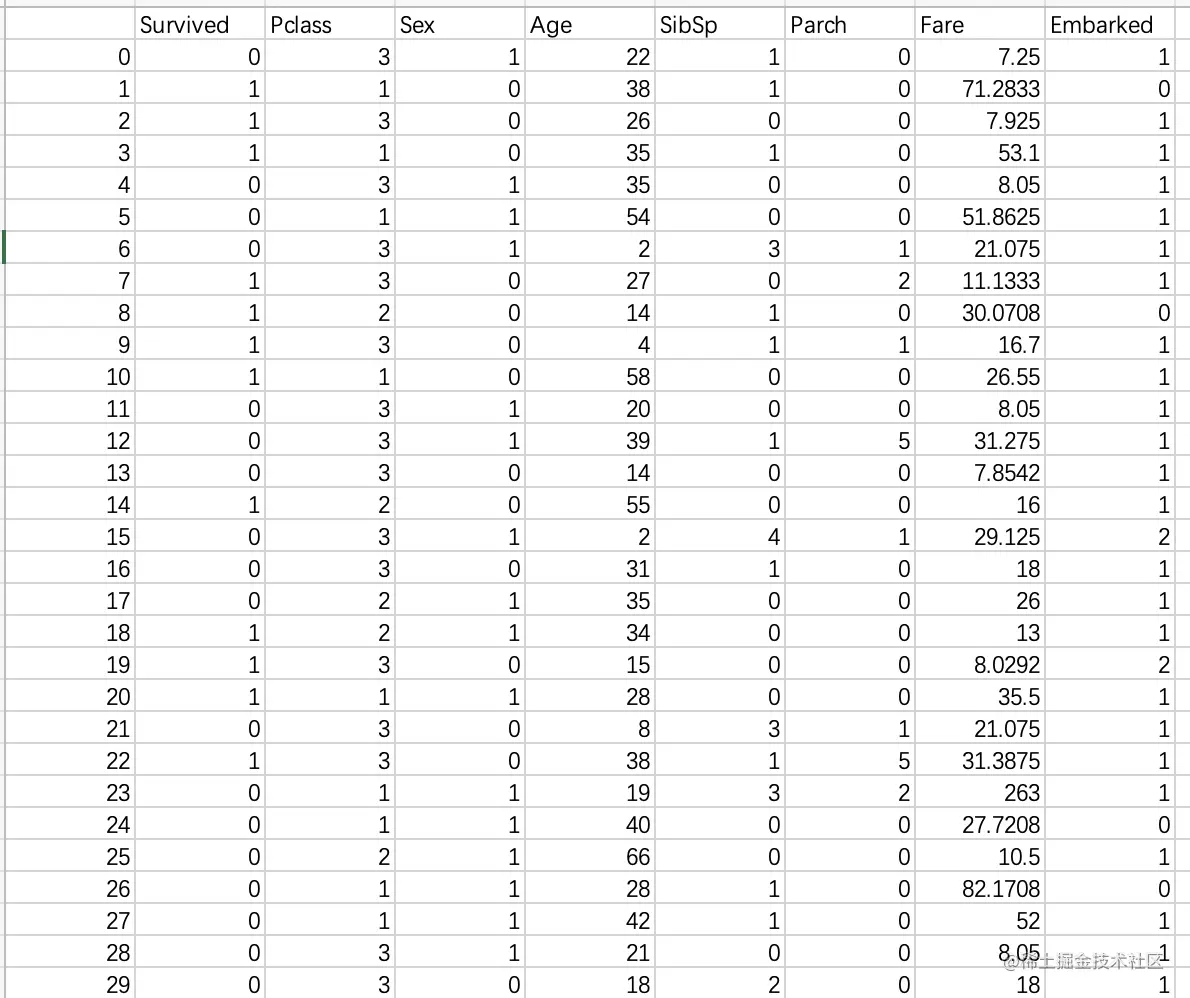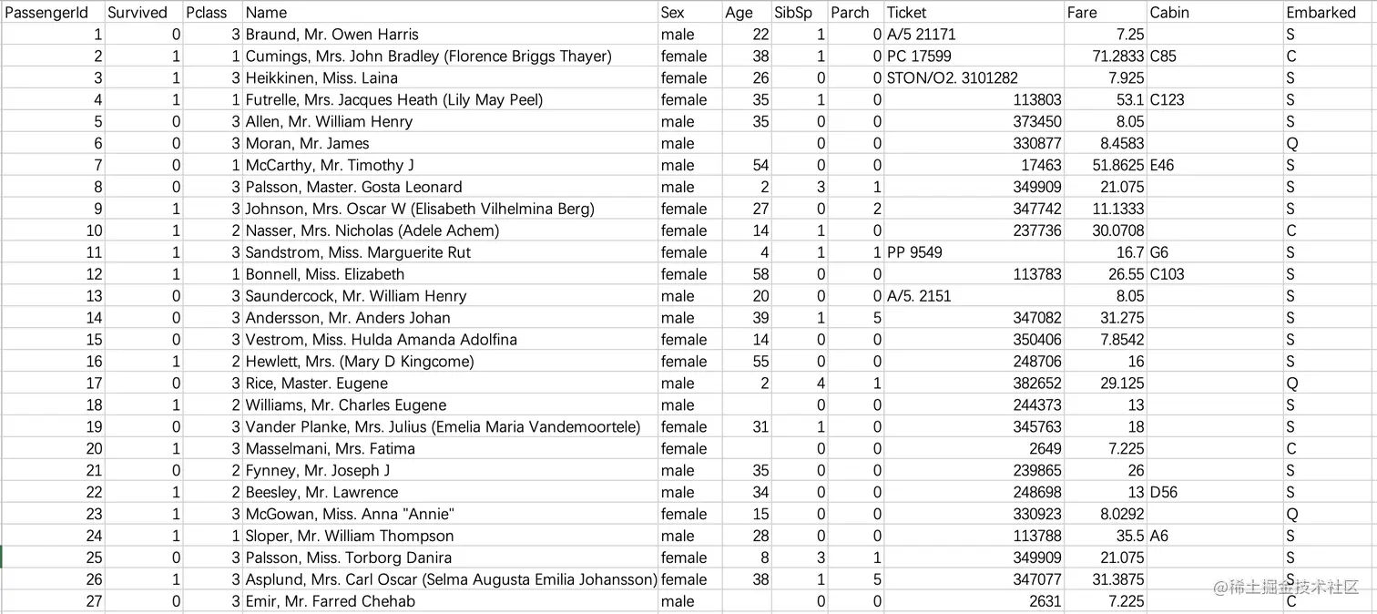 本项目使用的数据取自Kaggle网站的泰坦尼克号幸存者数据集,如下图。样本数量共891个,算上类别标签列总共有12个维度,包括姓名、性别、年龄、登船港口、票价等特征属性,其中Survived列是结果类别列(0代表死亡,1代表幸存)。