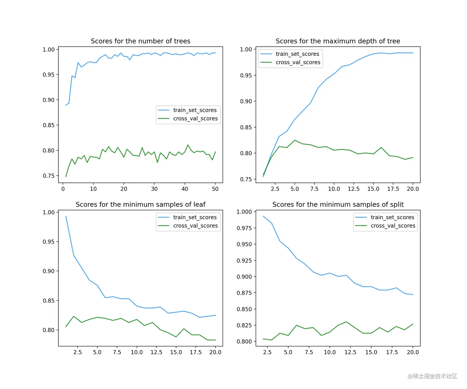 第三个参数是min_samples_leaf(左下图),代表叶子的最小样本数量。这个参数调整的得分图像基本呈下降趋势,故使用默认值1就好。