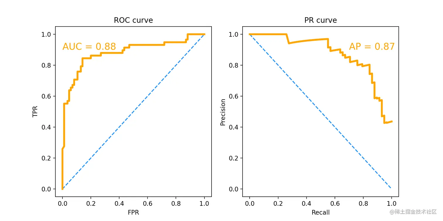 ROC曲线和PR曲线主要用来对比不同分类器之间的性能,其中ROC曲线对正负样本类别不平衡的数据集有很强的鲁棒性。