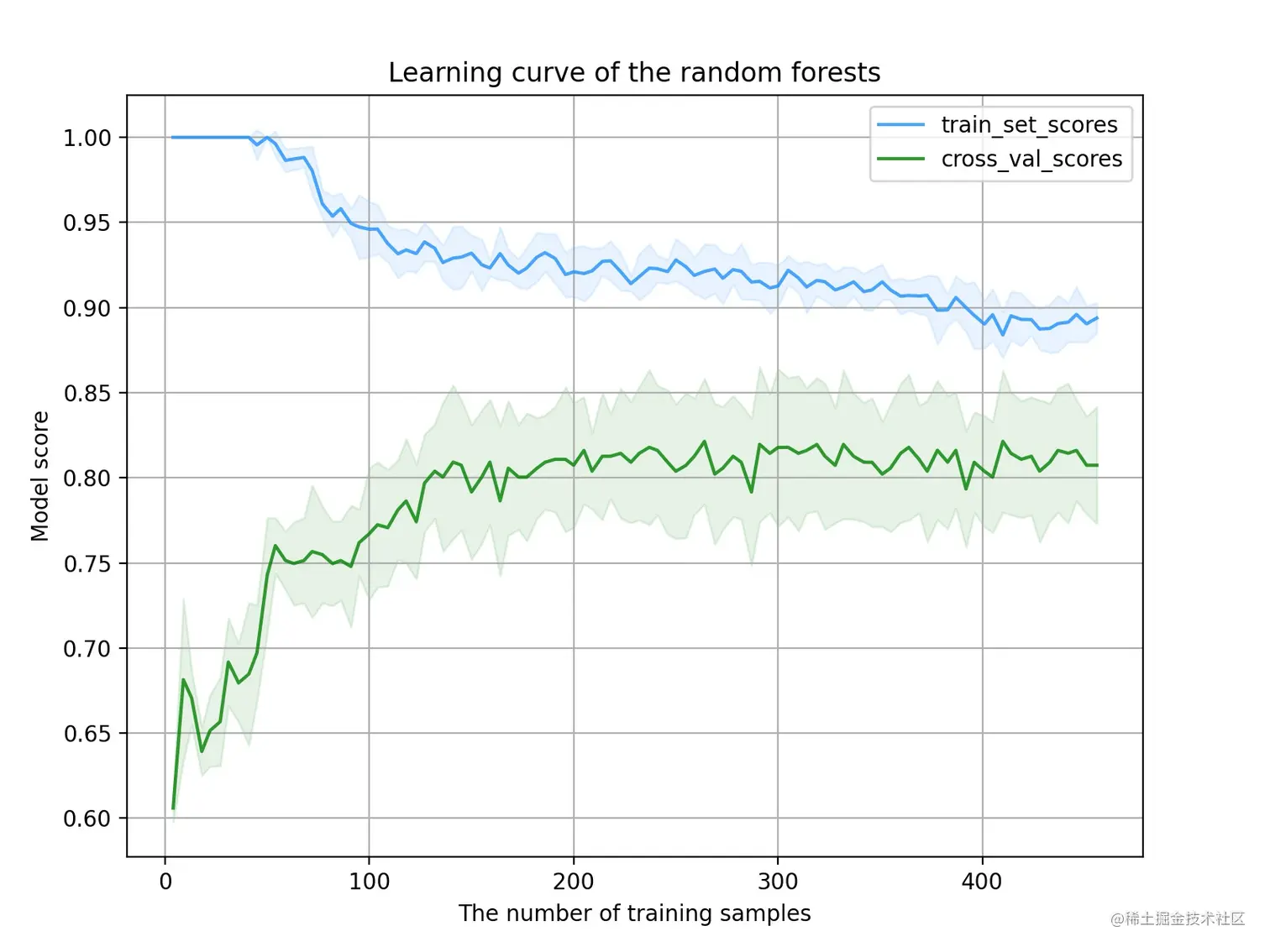 ax.fill_between(train_sizes, train_scores_mean - train_scores_std, train_scores_mean + train_scores_std, alpha=0.1, color="dodgerblue")