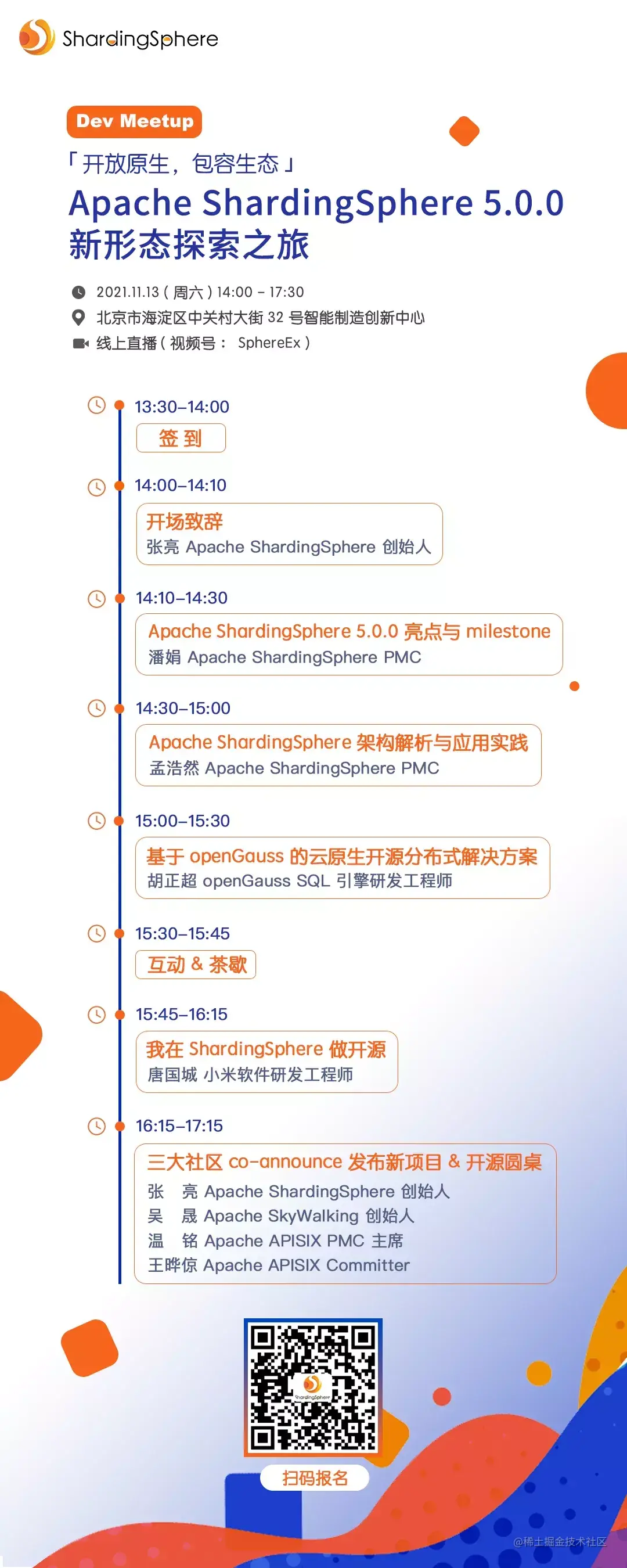 本周六,由 Apache ShardingSphere 社区主办的【Apache ShardingSphere Dev Meetup】将于北京市海淀区中关村大街 32 号智能制造创新中心 1 楼多功能厅举行。本次活动除了干货满满的技术分享外,社区还为大家准备了独家定制礼品以及精彩的社区活动。 终极预告,快随我们一起来看看吧!