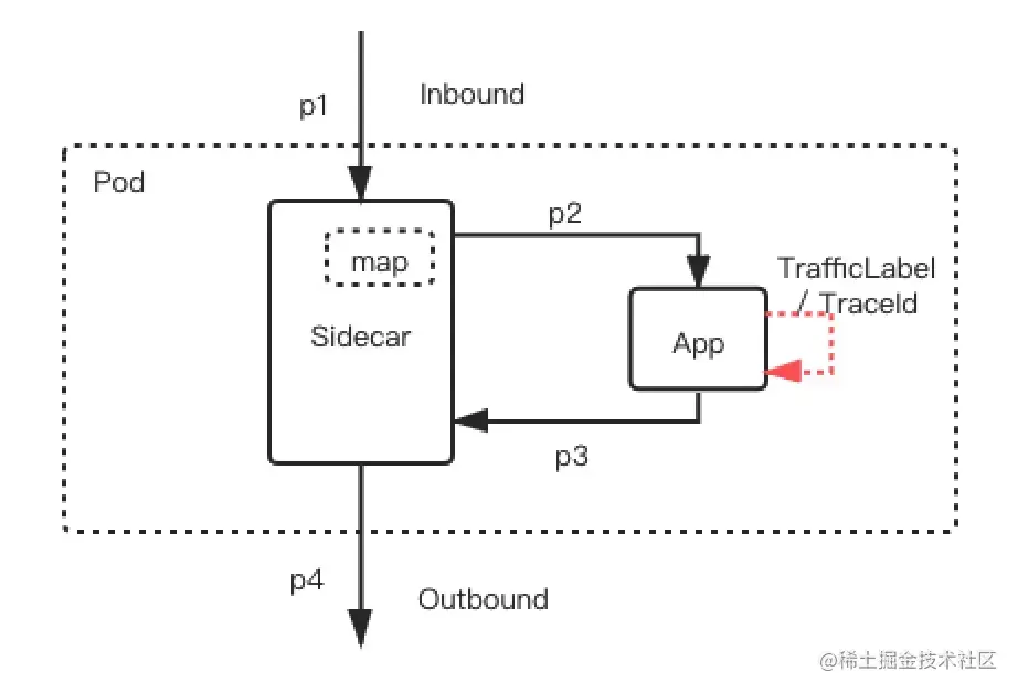 上图中,Sidecar 本来所看到的 inbound 和 outbound 流量是完全独立的,无法感知两者的对应关系,也不清楚一个 inbound 请求是否导致了多个 outbound 请求的发生。换句话说,图中 p1 和 p3 两个请求之间是否有对应关系 Sidecar 并不知情。