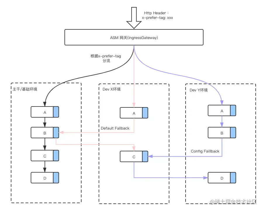下面是典型的一个基于流量打标和按标路由实现的多套开发环境治理功能;每个开发者对应的 Dev X 环境只需部署有版本更新的服务即可;如果需要和其他开发者联调,可以通过配置 fallback 将服务请求 fallback 流转到对应开发环境即可。如下图的 Dev Y 环境的B -> Dev X 环境的 C。