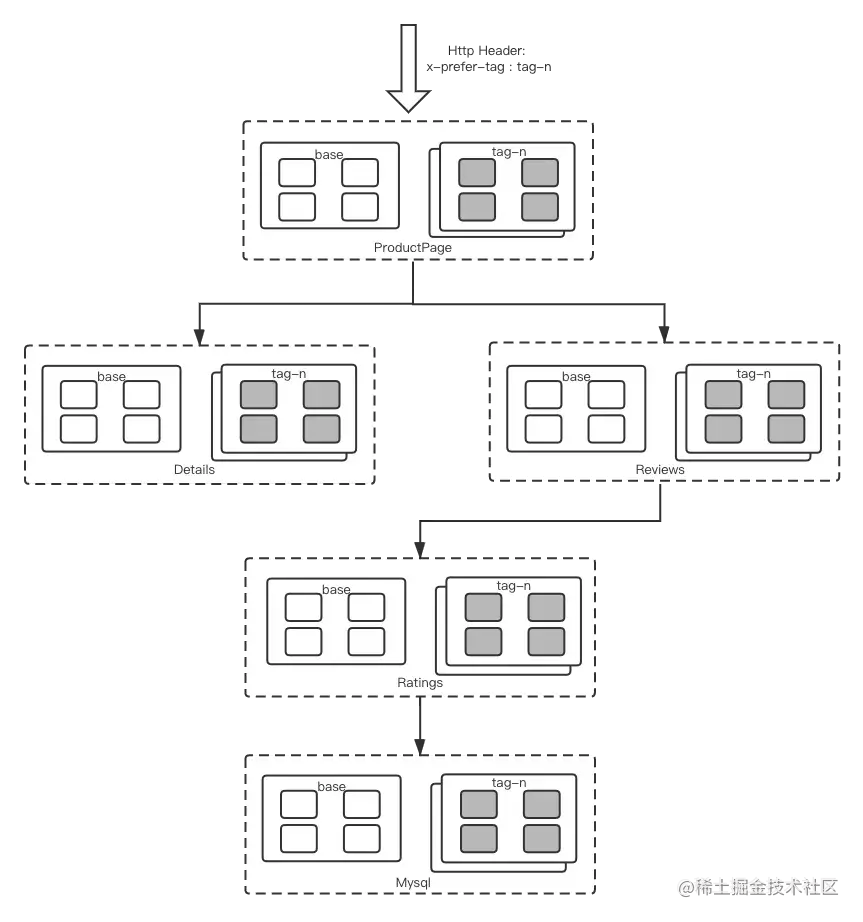 以 Bookinfo 为例,入口流量会带上期望的 tag 分组,sidecar 通过获取请求上下文(Header 或 Context) 中的期望 tag,将流量路由分发到对应 tag 分组,若对应 tag 分组不存在,默认会 fallback 路由到 base 分组,具体 fallback 策略可配置。接下来详细描述具体的实现细节。
