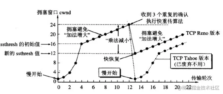 Reno算法所包含的慢启动、拥塞避免和快速重传、快速恢复机制,是现有的众多基于丢包的拥塞控制算法的基础。发送方维持一个叫做拥塞窗口cwnd(congestion window)的状态变量和慢开始门限ssthresh状态变量。ssthresh的用法如下: