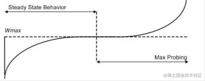 - 当cwnd < Wmax. CUBIC在凸函数区域,即拥塞避免区间,cwnd的增长随时间的增加而变小;