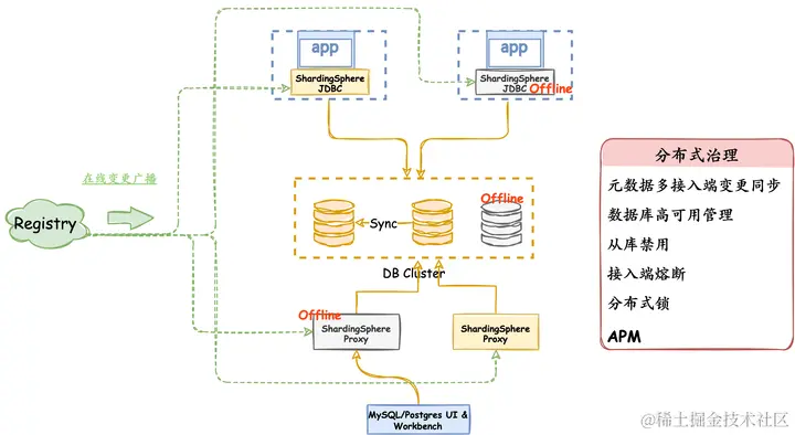 在存算分离的 ShardingSphere 生态里,数据库(存储节点)与 Proxy 及 JDBC(计算节点)的分布式治理、在线用户元数据 DDL 变更、存储节点及计算节点的运行时上下线、熔断与禁用、高可用能力都在这个版本基本完善,此外分布式锁功能也在规划当中。