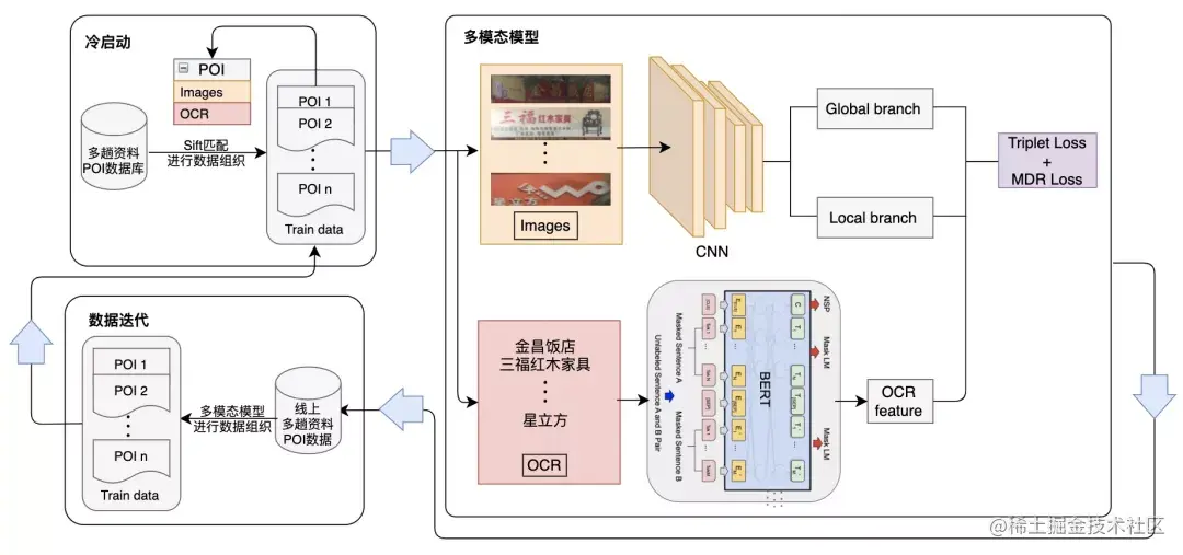 牌匾检索的技术方案主要包括数据迭代和模型优化两块。在数据生成部分,我们分为了冷启动自动生成数据以及模型迭代生成数据两个步骤。在模型优化部分,我们设计了一个多模态检索模型,包括视觉分支和文本分支两部分,主要是考虑到牌匾的文本信息比较丰富,因此将视觉信息与文本信息进行融合。针对视觉信息特征的提取,我们进一步设计了全局特征分支与局部特征分支,并分别进行了优化。整体技术框架如下图所示: