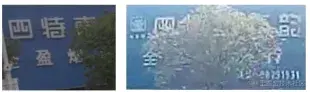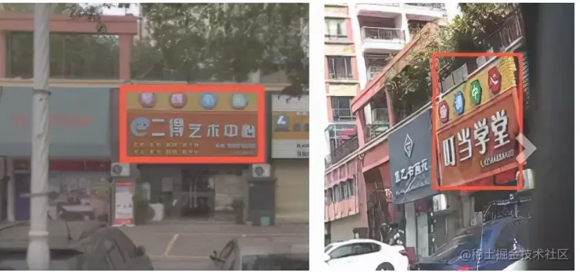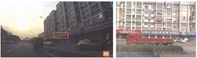 在道路场景中,经常存在树木以及车辆等干扰信息,并且由于拍摄视角原因,拍摄到的POI牌匾经常会面临严重的遮挡问题,如下图所示: